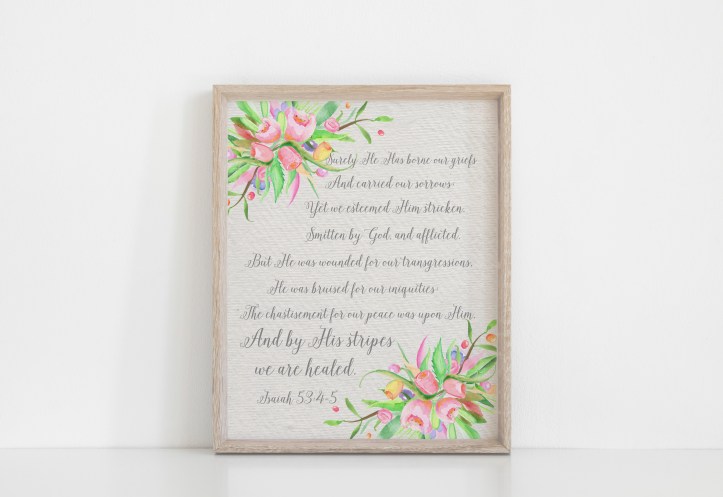 Download a FREE printable of the scripture Isaiah 53:5 – “…and with his stripes we are healed.”